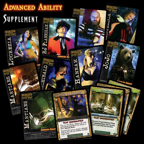 The IFOS Advanced Abilities Supplement is a Web-exclusive that features 10 new Advanced Ability cards (8 Hero and 2 Martian) as well as the new rules for using them, and also includes 4 new game cards for the Martian and Hero Decks. The new Advanced Abilities cards can be added to any existing Scenario as a way for both the Heroes and the Martians to gain experience during games unlocking powerful new abilities. There is a unique Advanced Ability for each Hero character, allowing them to "level-up" and use a super-powered version of their Talent, as well as new global abilities that the Martians can get.