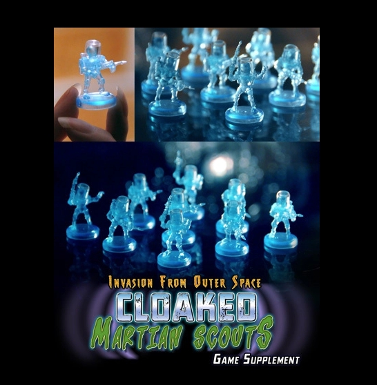 As the invasion begins, a small band of elite Martian Scouts activate their stealth Cloak Suits and sneak into the area ahead of the first waves, virtually invisible to the Human eye. The 'Cloaked Martian Scouts' Supplement is a Web-exclusive that features 9 crystal light blue Cloaked Martian Scouts miniatures (with clear helmets) and a new scenario, 'The Beacon'. The scenario is printed in full color as part of the rules sheet.