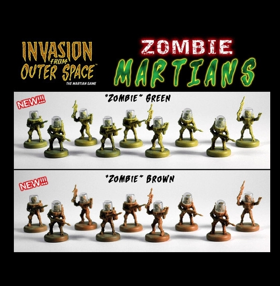 This is a very special set of Martian miniatures from Invasion From Outer Space game but with a twist! We made these Martian figures in Zombie Colors to match Last Night on Earth's Brown and Green Zombies. This can be very useful in LNOE/IFOS Crossover games because when a Zombie kills a Martian, it can rise again as a Zombie Martian!!! Set of nine Martians in Brown or Green with separate clear Helmets (allowing you to paint them before gluing on the helmets if you wish).