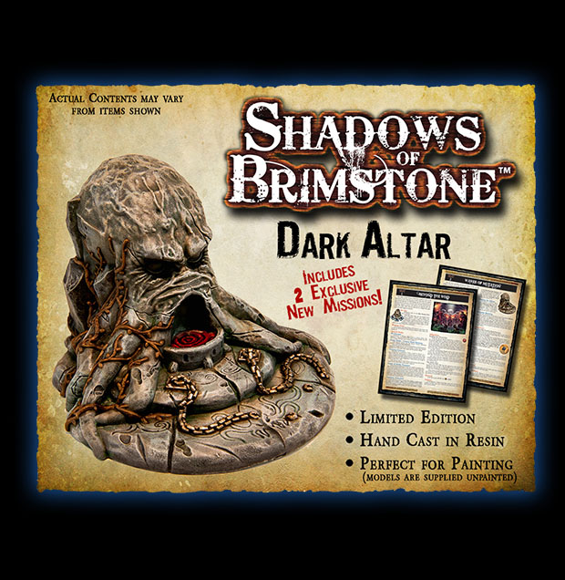 This deluxe resin terrain piece depicts a massive and grotesque altar to the dark gods of old! Whether fashioned by the Order of the Crimson Hand for their dark rituals, or the mutated Takobake Samurai Clan in an attempt to harness the power of the Void, this stone altar makes a beautiful centerpiece. Includes 2 brand new Missions that utilize the Dark Altar for gameplay to add to your games of Shadows of Brimstone: "Beyond the Void" and "Waves of Mutation"!