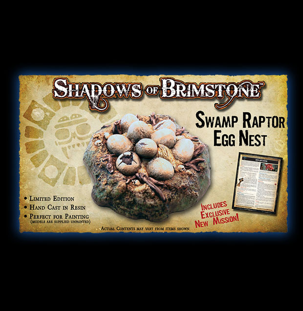 Includes a 3D version of the Egg Nest, first appearing in the Swamps of Death Core Set as part of the Map Tile artwork for the Swamps of Jargono OtherWorld. This set features a brand new mission exclusive to this set: "Stolen Eggs"