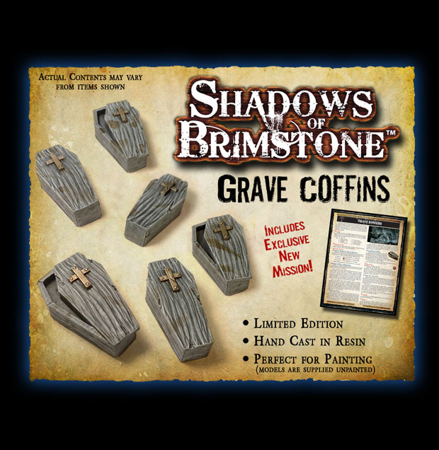This set includes 3D versions of the Coffin Tokens found in the Feral Vampires Mission Pack and can be used to replace these tokens with Vampire Mission Pack missions. But, this set also includes an exclusive new mission: "Grave Robbers"!
