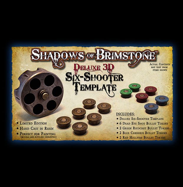 Includes a 3D version of the Six-Shooter Template for Shadows of Brimstone and lets you track your Gunslinger s Special Ammo in style! This set comes with the Deluxe Six-Shooter Template, 6 Dead Eye Shot Bullet Tokens, 2 Green Ricochet Bullet Tokens, 2 Blue Cerberus Bullet Tokens, and 2 Red Hellfire Bullet Tokens.