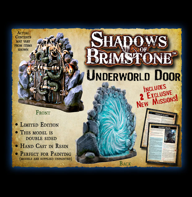 The ancient doors to the Underworld are sealed with magical runes and sigils to keep the terrors that lay beyond trapped. Sometimes the magic of these runes falters, and the doors begun to buckle... and break! A double-sided centerpiece (Underworld Doors on one side, and a terrifying Infinity Gate on the other side), this set also includes two brand new Mission using the Underworld Door in your games of Shadows of Brimstone: "Horror at the Gates" and "Valitore's Calling".